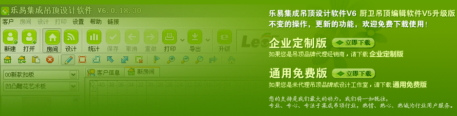 樂易集成吊頂設(shè)計軟件V6可以在本站上免費下載安裝,我們非常希望您能把使用過程中的問題、意見、建議及時反饋給我們,以便我們不斷完善和升級軟件。